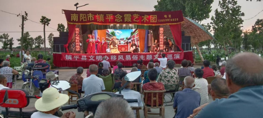 与美食节主会场相邻的文化广场上,镇平县文明办移风易俗主题文艺巡演同步上演。南阳市镇平念霞艺术团带来的戏曲、小品等节目,将移风易俗内容巧妙融入表演。演员们用通俗易懂的台词、生动形象的演绎,讲述婚事新办、丧事简办、孝老爱亲等文明理念,台下村民听得津津有味,不时鼓掌叫好。