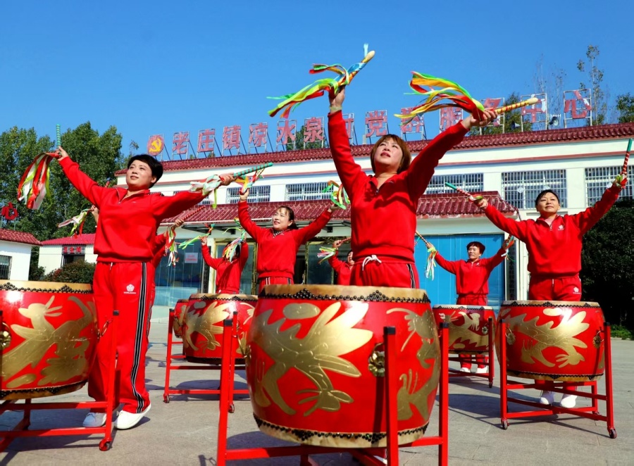 龙鼓舞蹈表演队在服务中心广场进行表演。