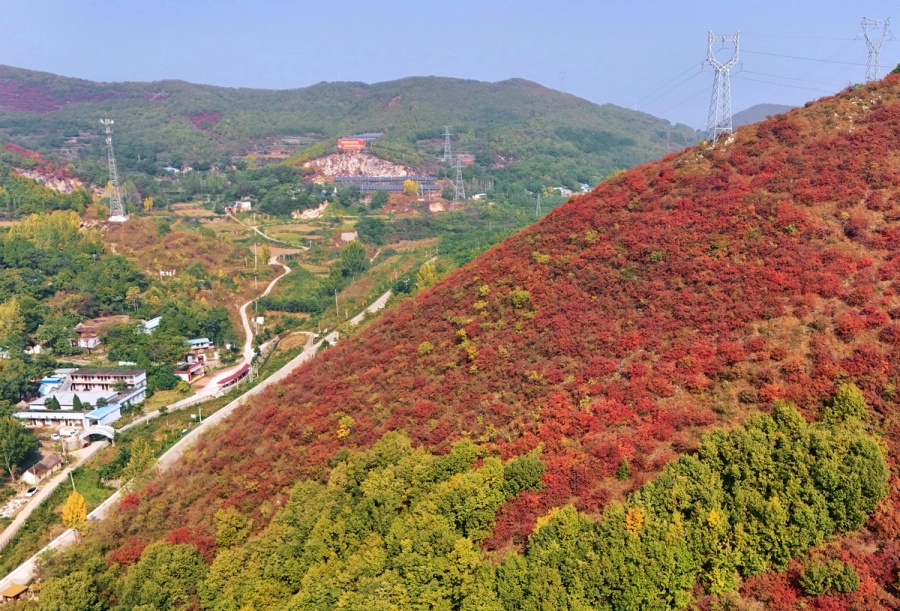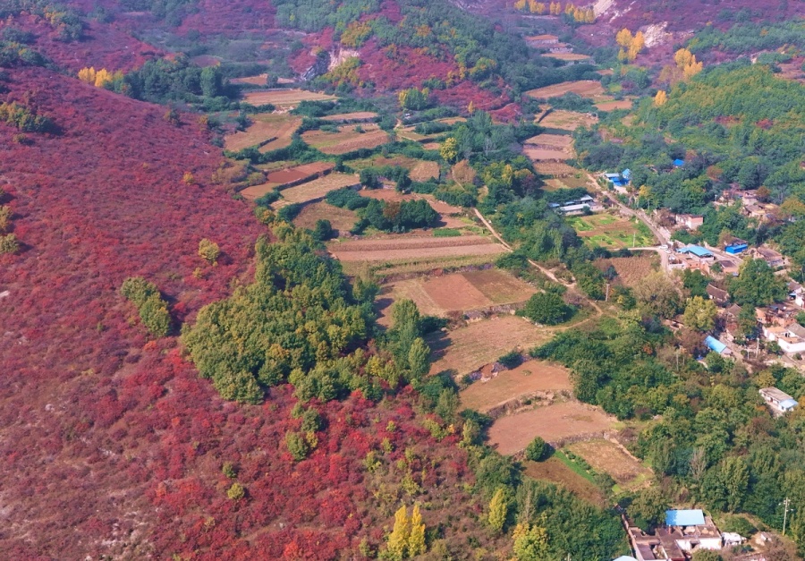 满山的红叶、山路与村庄交相辉映。