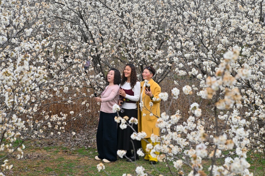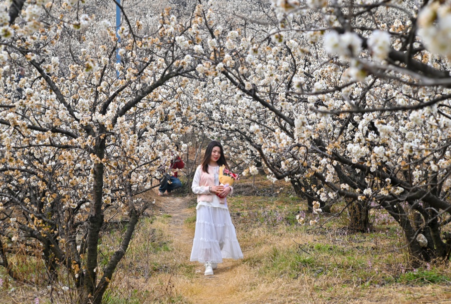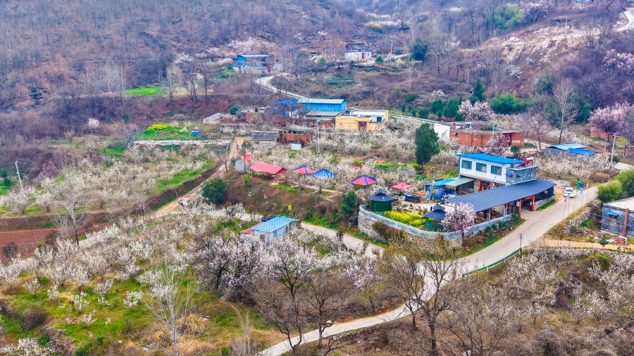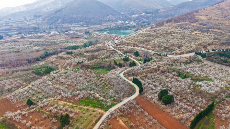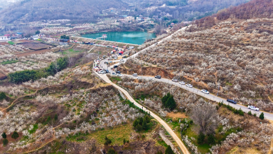 3月13日,在镇平县老庄镇樱桃沟,漫山遍野的樱桃花如期绽放,如云似雪,铺满山野,一幅生动的春日画卷徐徐展开,吸引众多游客前来拍照打卡。张峰 摄