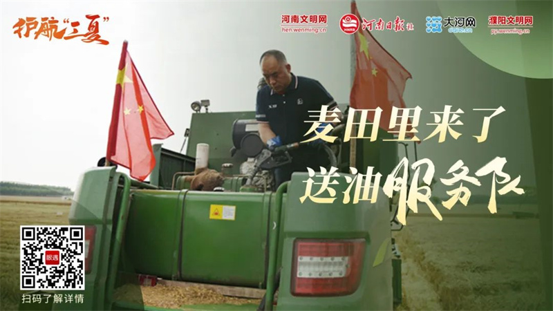 6月5日,濮阳市经开区胡村乡柳门村的麦田里,小麦收割机、秸秆打捆机正在田间来回穿梭,呈现一派丰收的景象。不远处,挂有“经开区‘三夏’麦收农机用油保供点”红色条幅的专用油罐运输车正停在地头,随时准备为麦田里的农机加油。
