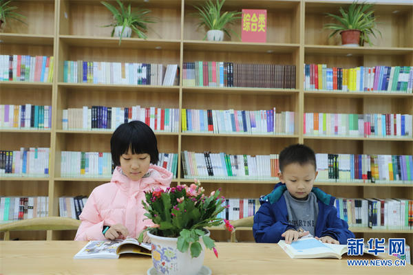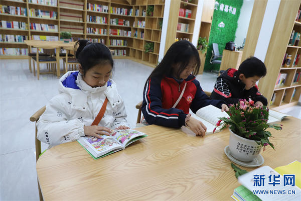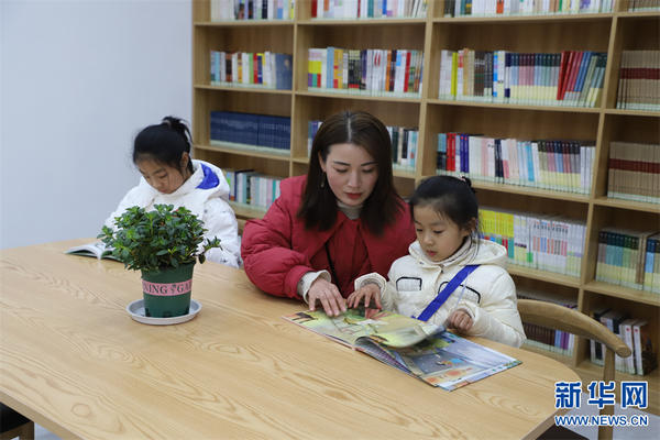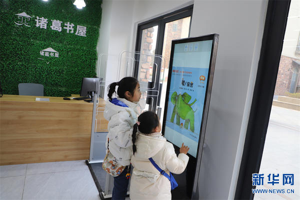 2月19日,河南省南阳市镇平县将军路财富世家小区诸葛书屋,两名小读者在检索书籍。