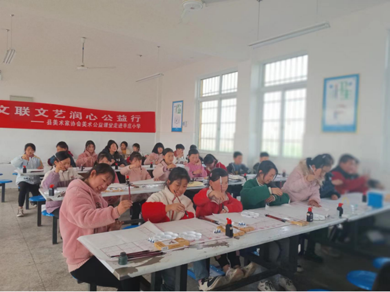 辛庄小学位于镇平县文联所帮扶的贫困村所在地,当了解到这里的孩子们由于种种原因缺少专业的国画课时,县文联及时组织文艺志愿者,为该校提供持续的美术公益课,用小小画笔点亮孩子们的多彩童年,助力乡村振兴。