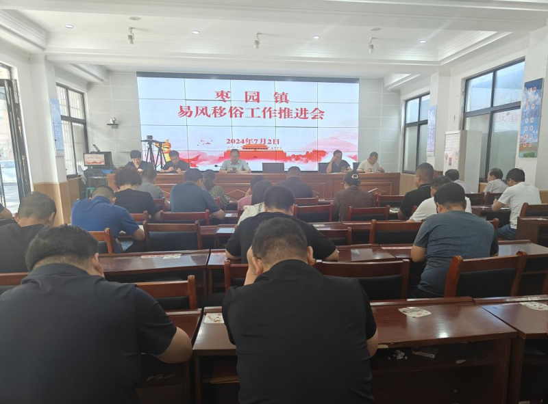 7月2日上午,枣园镇召开移风易俗工作推进会,旨在深入实施乡村振兴战略,打造文明和谐乡村。镇党委书记主持会议,强调移风易俗对提升乡村文明的重要性,号召全镇上下齐心协力。